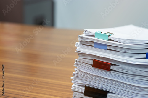 Close up pile of unfinished paperwork on office desk waiting to be managed and inspected. Stack of homework assignment with colorful paper clips. Report papers stacks. Business and education concept.