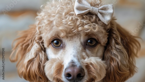 Close Up Portrait Of A Light Brown Dog With Bow