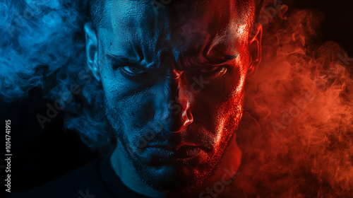close up portrait of a man with a serious expression illuminated by blue and red smoke creating a dramatic and intense atmosphere The man face is covered in sweat adding to the sense of exertion