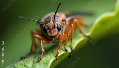 Close up portrait of a orange and black insect with large eyes, long antennae and mandibles
