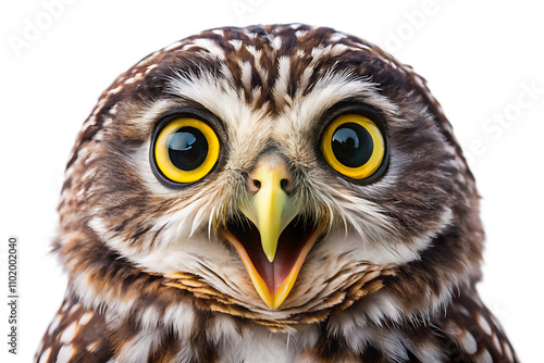 Close up portrait of a surprised Owl isolated on white background as transparent. PNG. AI GENERATED