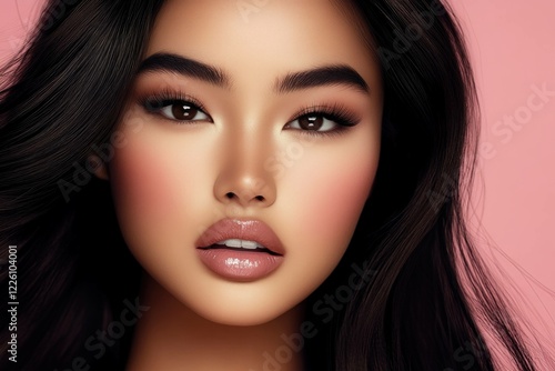 Close up portrait of a young Asian woman with flawless skin and glossy lips, exuding confidence against a soft pink background