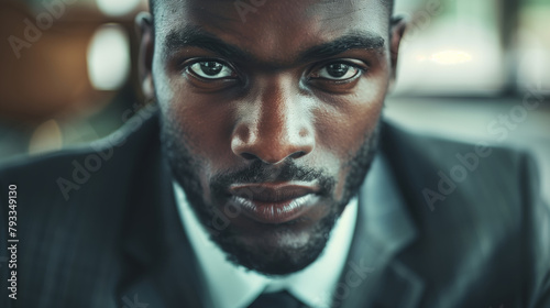 Close up portrait of confident African businessman focused on work in office, looking at camera