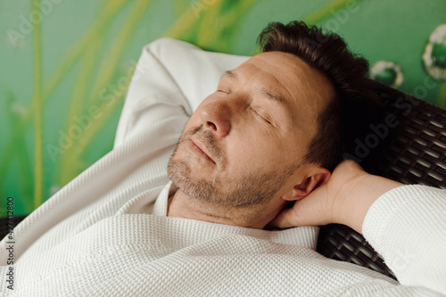 Close up portrait of handsome attractive peaceful man enjoying free time with closed eyes. spa relaxation concept
