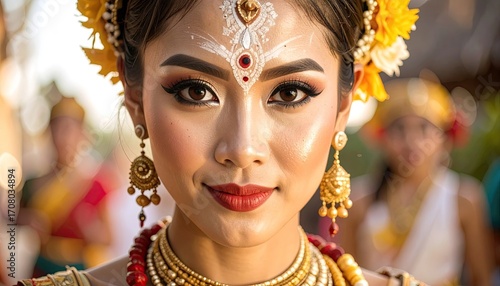 Close up Portrait of Smiling Woman with Intricate Face Paint and Traditional Yellow Floral Hairpiece in Blurred Background