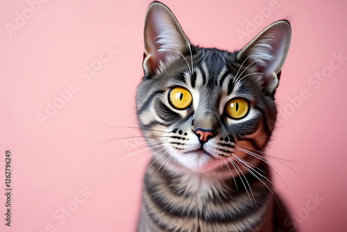 close up portrait of striped cat with bright yellow eyes against pink background, showcasing its curious expression and detailed fur texture