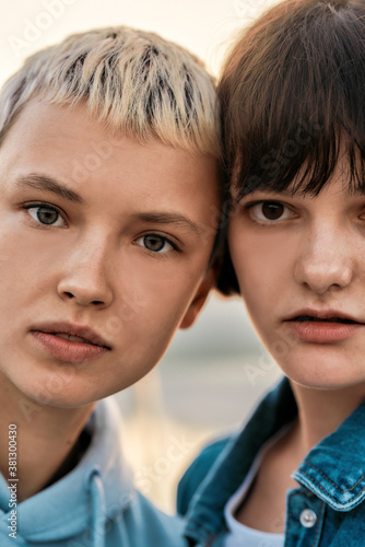 Close up portrait of two attractive young women with short hair looking at camera, Young lesbian couple spending time together