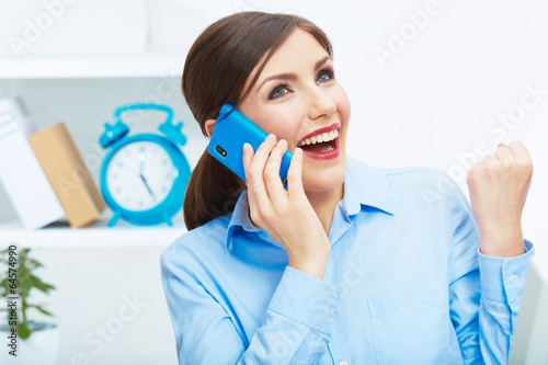 Close up portrait of young business woman phone call, seating i