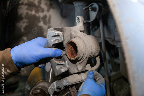 Close up Professional car mechanic changing front brake pads in auto repair service. Autoworker repair brakes in garage of repair service station