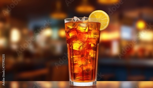 Close up realistic Long Island Iced Tea cocktail standing on bar counter against bar background