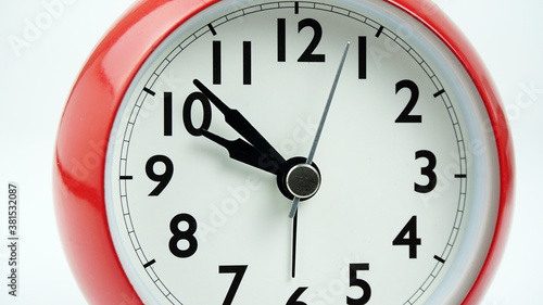 Close up Red Alarm clock time 09.52 am. on white background, Time concept.