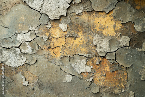 Close up reveals peeling paint and cracks on a wall, exposing yellow underlayers. The texture indicates age, wear, and damage to the surface