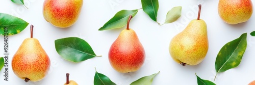 Close up ripe pears and leaves on a white background. Pear fruit texture