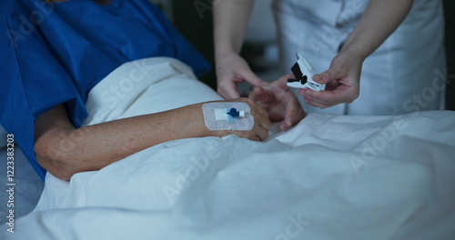 Close up shot doctor helps the elderly patient by fitting an oximeter onto her finger to monitor oxygen levels in her blood.