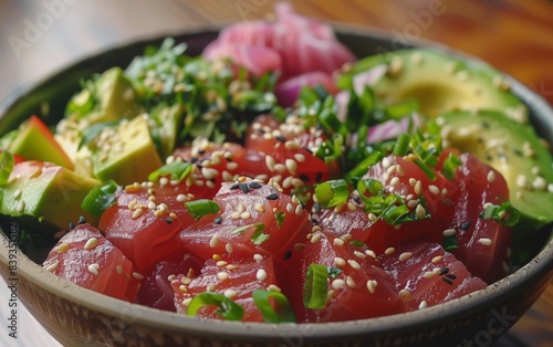 Close up shot of a bowl of tuna poke with avocado, sesame seeds and other toppings