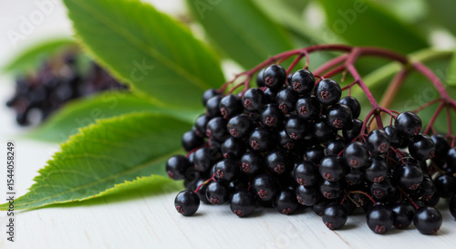 Close up shot of a bunch of elderberries with green leaves on a white surface creating a natural scene