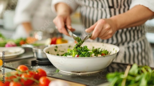 Close up shot of a chef s hands carefully chopping and arranging fresh vegetables and greens in a bowl during a senior cooking workshop focused on using natural sweeteners in meal