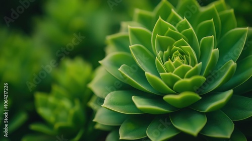 Close up shot of a lush verdant green succulent plant with intricate leaf patterns and textures in a natural peaceful garden or outdoor setting Showing the beauty and elegance of botanical nature