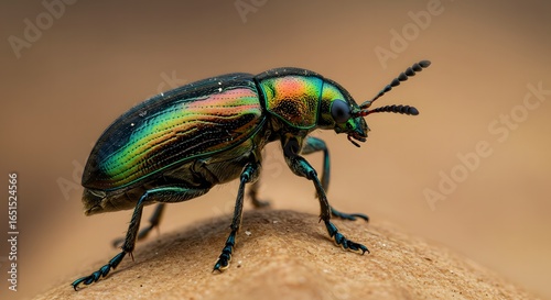 Close up shot of a vibrant iridescent beetle with long antennae standing on a textured surface