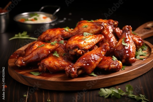 Close up shot of barbecue chicken wings on wooden tray with selective focus
