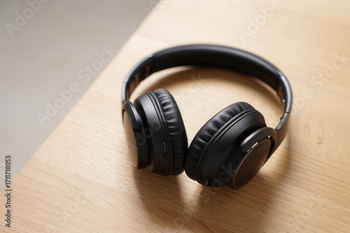 Close up shot of black wireless headphones resting on a light wooden surface in a well lit environment