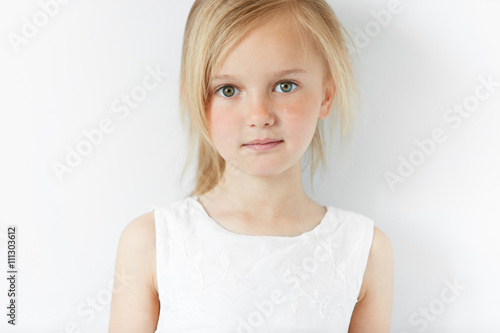 Close up shot of cute fashionable child with green eyes and blonde hair weraing white dress, looking at the camera with serious expression. Portrait of adorable little girl. Happy childhood concept