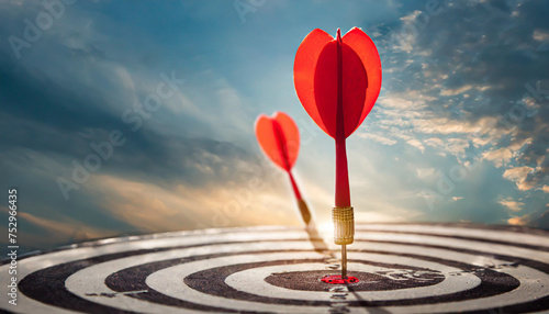 Close up shot red darts arrows in the target of dartboard center on dark blue sky background. Business target or goal success and winner concept.