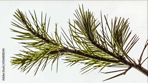 Close up shows a coniferous branch silhouetted against a bright white background, soft light.