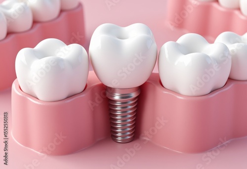 Close up shows white teeth and a dental implant in a pink gum model presented against a light pink background
