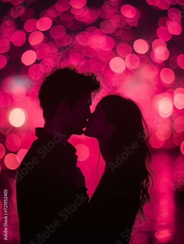 Close up silhouette of couple kissing at sunset. Man and woman couple kissing. Pink Bokeh. Generated AI.