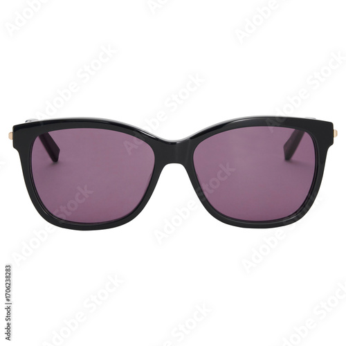 Close up studio shot of black framed sunglasses with purple tinted lenses