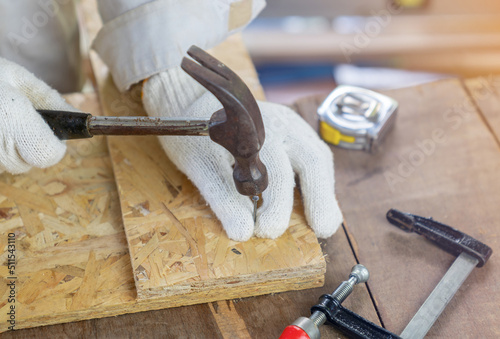 Close up the carpenter ware white gloves hold hammer hit nail on oriented strand board,.