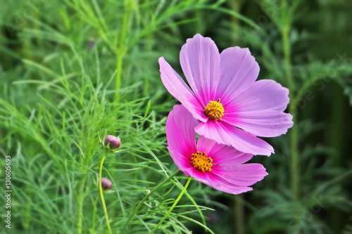 Close up the pink cosmos blooming. soft focus with blurred green leaves background.
