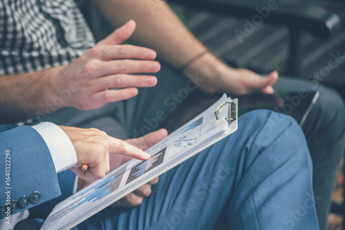 Close up Two Businessman caucasian hands using smartphone digital tablet discussion sitting wood table green garden. Two Man hands hoding touch screen smart phone surf internet relax in green park