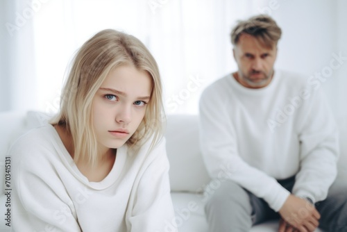 Close up upset girl in front and man behind sit at sofa avoid to talk after quarrel at home, offended teenager daughter and middle aged father argument, family conflict concept