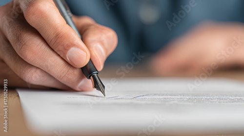Close up view, man holding pen and signing lease or rental paper agreement, buying personal insurance coverage, committing to bank loan, credit line, or investment, accepting vendor or supplier terms