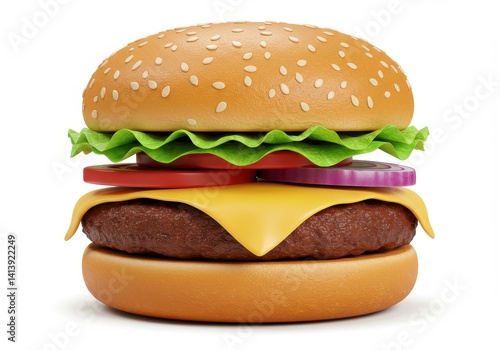 Close up view of a burger with lettuce tomato onion cheese and sesame seed bun on white background