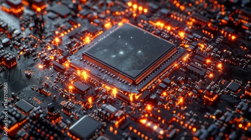 Close up view of a computer processor, glowing with orange and red light, on a dark circuit board. The processor shows intricate detail and complex circuitry.