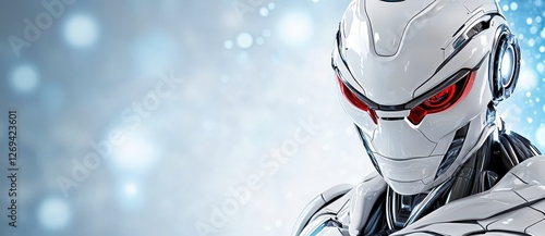 Close up view of a futuristic robot with a white helmet and glowing red eyes, set against a blurred background of blue and white. The robot's