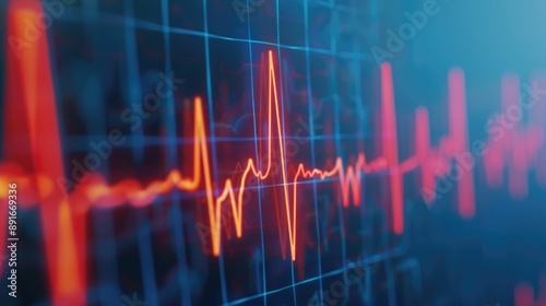 Close up view of a medical heartbeat monitor display showing an electrocardiogram ECG waveform with a deep depth of field representing vital health data and diagnostic information