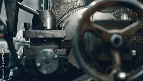 Close up view of a metal lathe expertly shaping a metal workpiece, highlighting the intricate precision and complexity involved in industrial metalworking processes