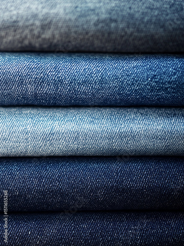 Close up view of a stack of folded denim jeans in varying shades of blue tone