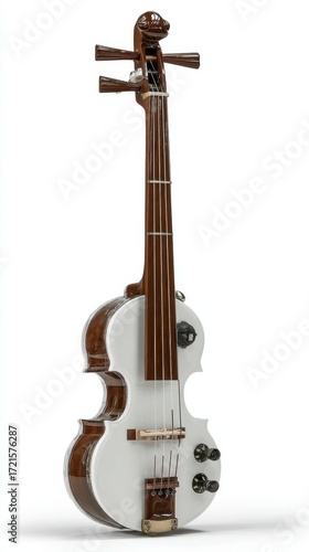 Close up view of a white electric violin with brown wooden neck, tuning pegs, and body. The instrument is shown against a white background.