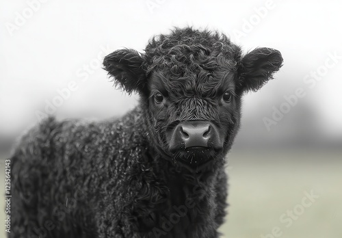 Close up view of a young, black calf covered in a light dusting of snow. The calf stands in a blurred, out of focus field, its dark fur contrasting