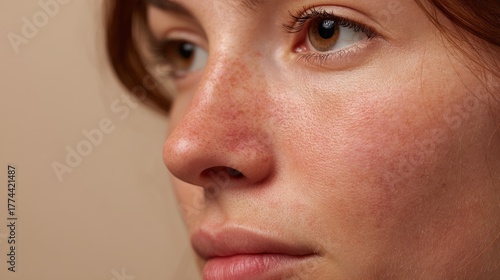 Close up view of a young Caucasian woman experiencing severe facial rosacea Skin issues Set against a beige background