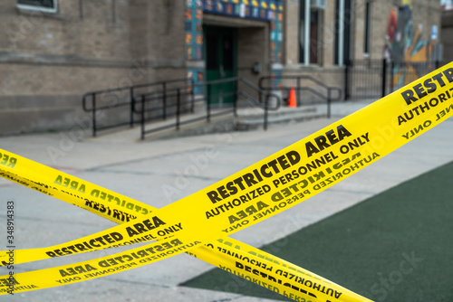Close up view of an x shaped barrier of yellow restricted area caution tape blocking off a playground at a school in Chicago.