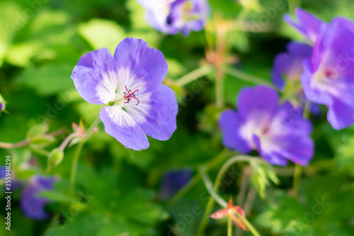 Close up view of bright beautiful geranium rozanne flower with green leaves on daylight. Beauty in nature. Flowers with purple petals, summer time