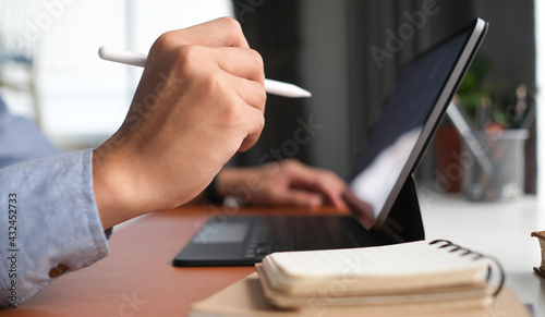 Close up view of businessman hand holding stylus pen pointing on screen of computer tablet.