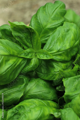 Close up view of fresh green basil leaves on grey background. Natural food background.