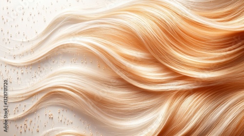 Close up view of long, wavy blonde hair with subtle highlights, set against a textured off white background with small, sparkling particles.